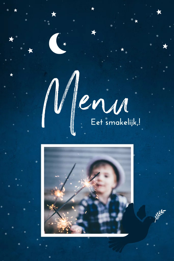 Goudfolie menukaart met sterretjes, duifje en foto op donkerblauw