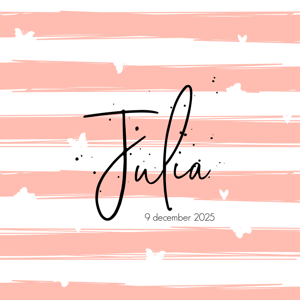 Stoer geboortekaartje voor een meisje met strepen en goudfolie vlindertjes. Want als je naar zo'n kleintje kijkt krijg je toch vlinders in je buik? Als je het leuk vindt, kun je ook de naam in goudfolie zetten.