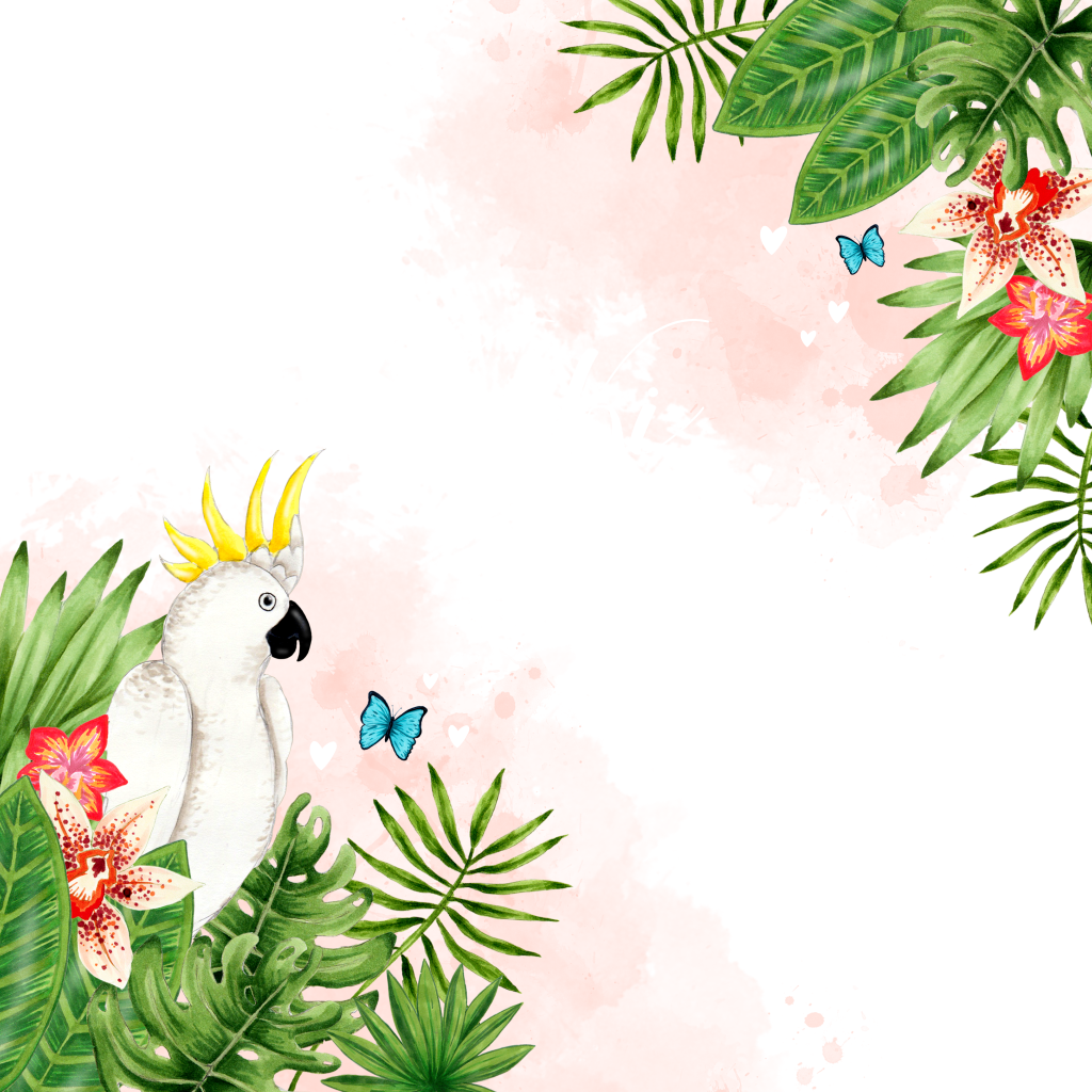 Een hip geboortekaartje met jungle illustratie en goudfolie hartjes. Pas zelf de teksten aan.