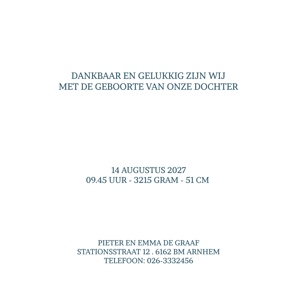 Mooie geboortekaart voor een meisje met naam en geboortedatum in goudfolie. De foto staat in een krans van bloemen. De foto en de tekst kunnen in de editor aangepast worden. Let op: Deze kaart heeft een langere verzendtijd: voor 18.00 uur besteld = de volgende werkdag gedrukt en verzonden.