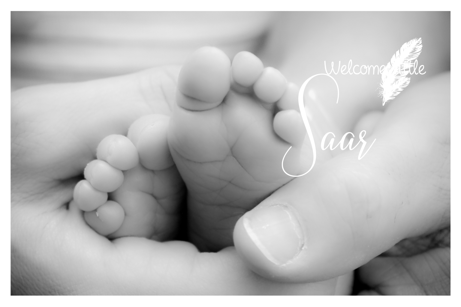 Liggend geboortekaartje met foto-achtergrond en tekst in luxe goudfolie. Origineel zijn de veren bij de naam. Iets voor jouw dochter? Maak hem zelf af!