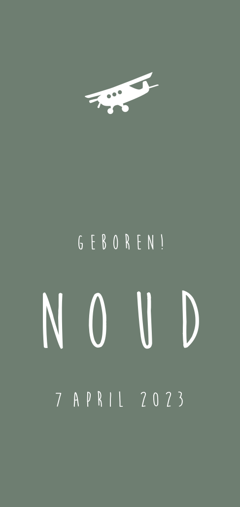 Stoer geboortekaartje voor de geboorte van je zoontje met een hippe combinatie van een vliegtuig in goudfolie op een donkergroene achtergrond.