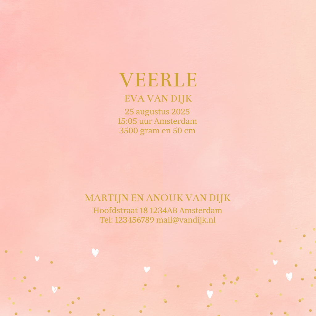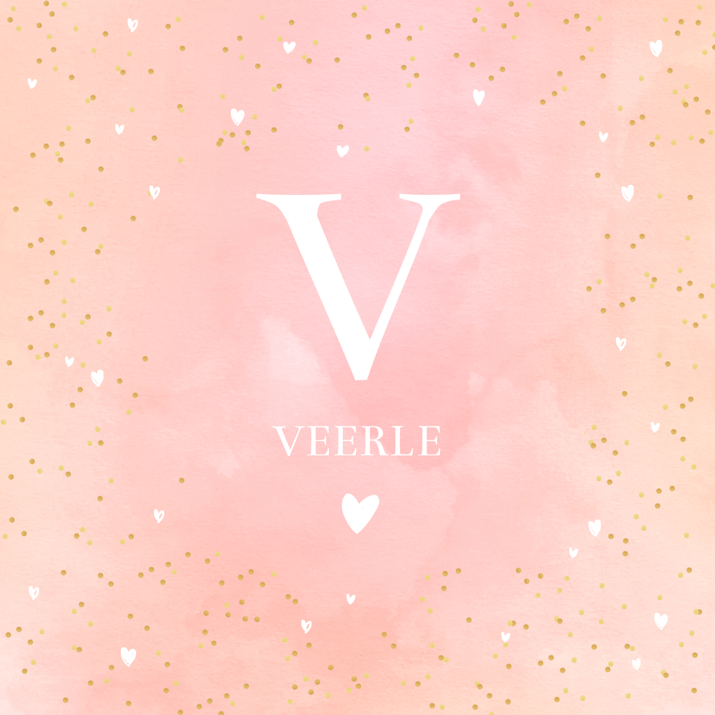 Een mooi en stijlvol geboortekaartje voor een meisje, met hartjes, letter in goudfolie en confetti. Pas zelf de teksten aan.