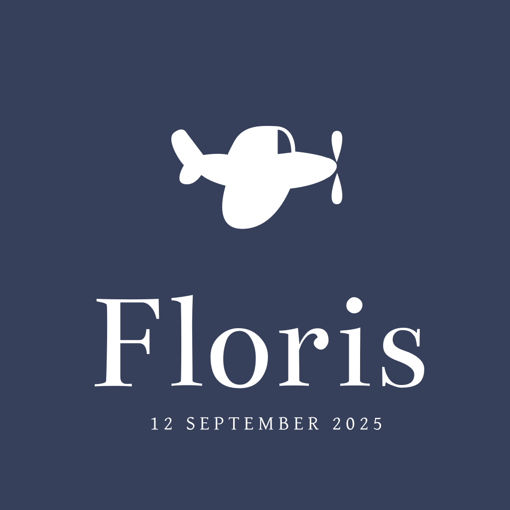 Hippe geboortekaart voor je pasgeboren zoontje met een hip goudfolie silhouet van een vliegtuigje op een donkerblauwe achtergrond.