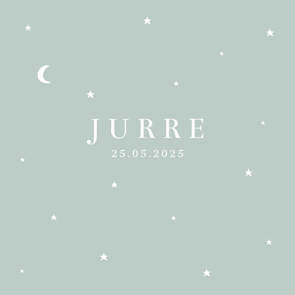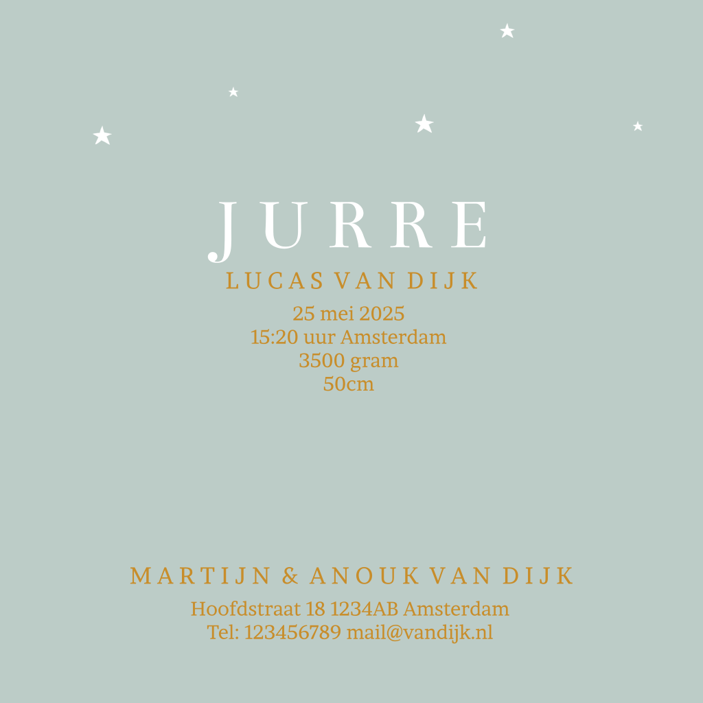 Een mooi geboortekaartje voor een jongen met sterretjes en maan. De naam en geboortedatum worden in goudfolie gedrukt. Helemaal hip! Alle kleuren zijn aanpasbaar. Pas de tekst makkelijk aan in de editor.