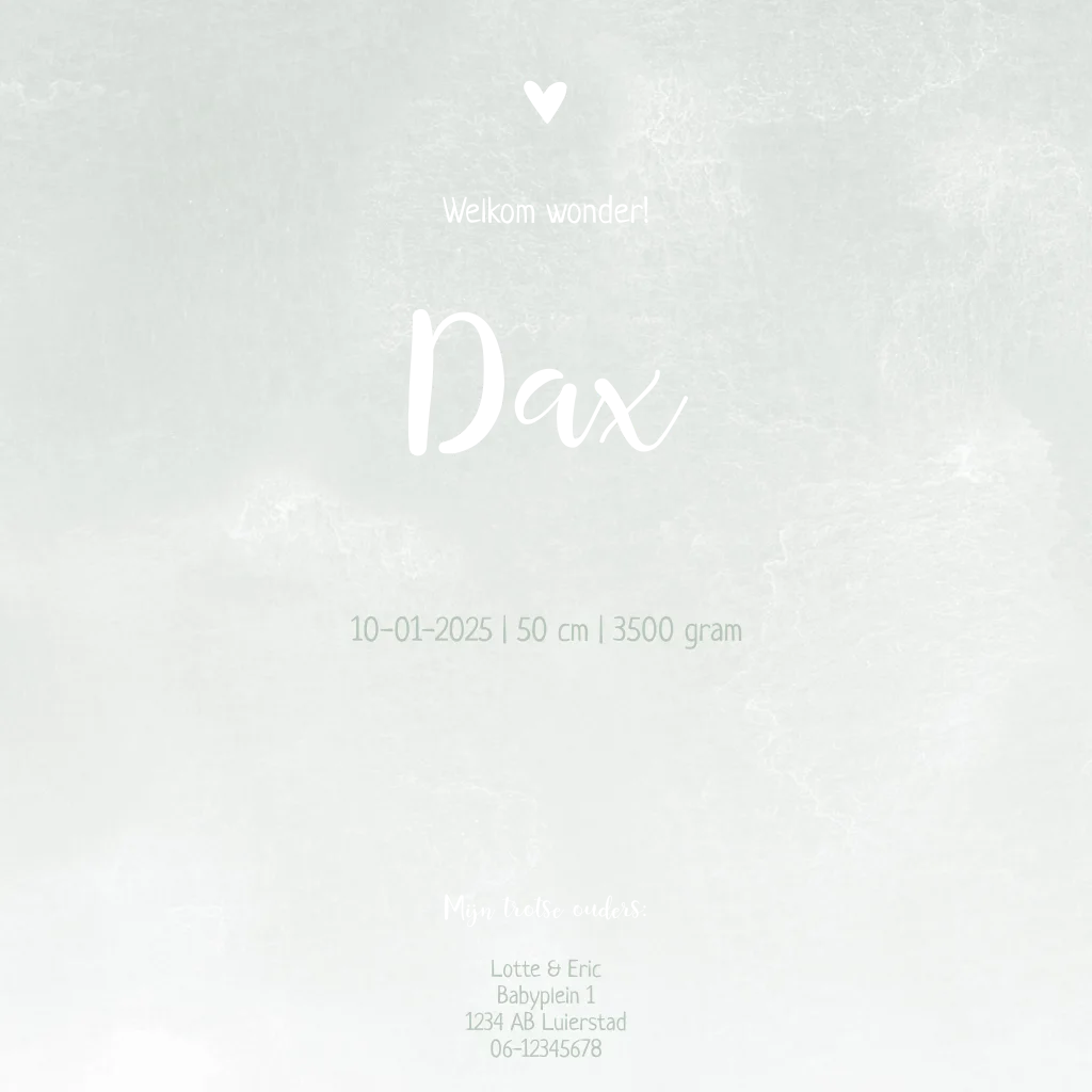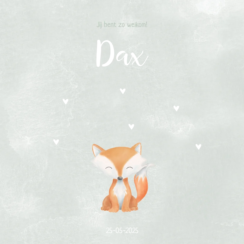 Hip goudfolie geboortekaartje voor je zoontje met een geschilderde vosje op een achtergrond van grijs/groene waterverf. De hartjes en babynaam worden in goudfolie gedrukt en maken dit kaartje echt speciaal!