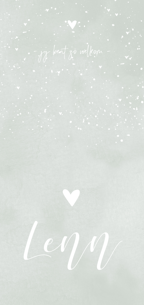 Trendy geboortekaartje voor je zoon met aquarelverf achtergrond in olijfgroen en witte spetters en lieve goudfolie hartjes.