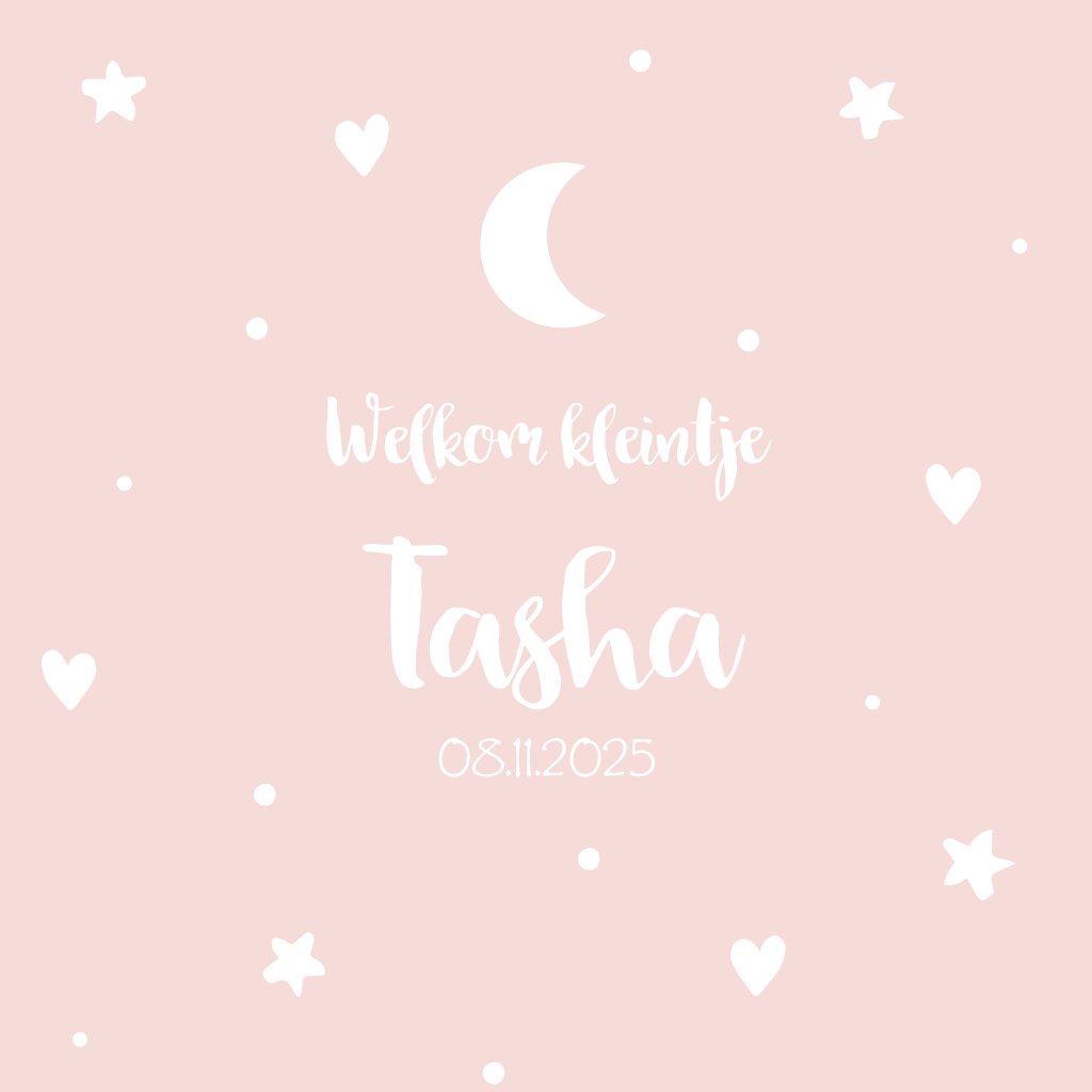 Hartjes, sterren, stippen en een maantje van goudfolie: wat lief en trendy op je babykaartje! De oudroze kleur evenals de lettertypes kunnen eventueel worden aangepast. Maak er jouw eigen kaartje van!