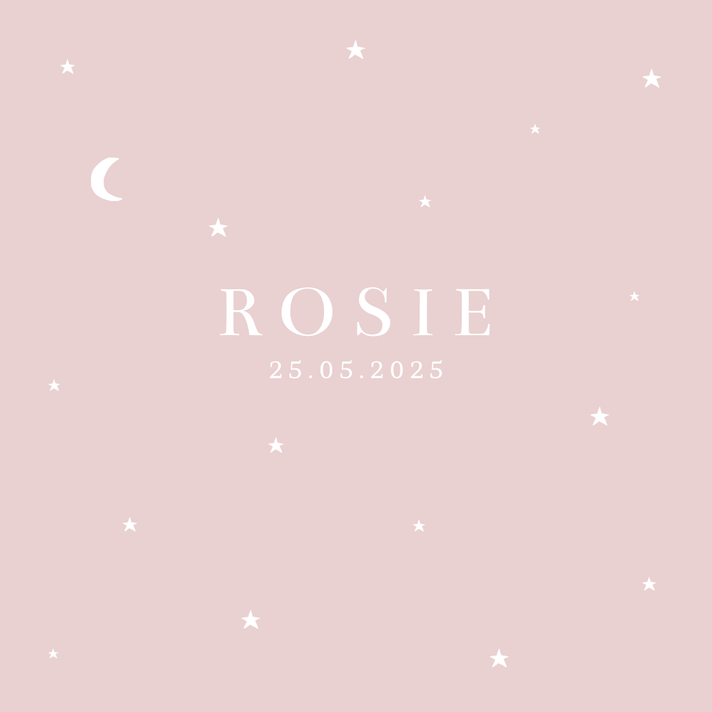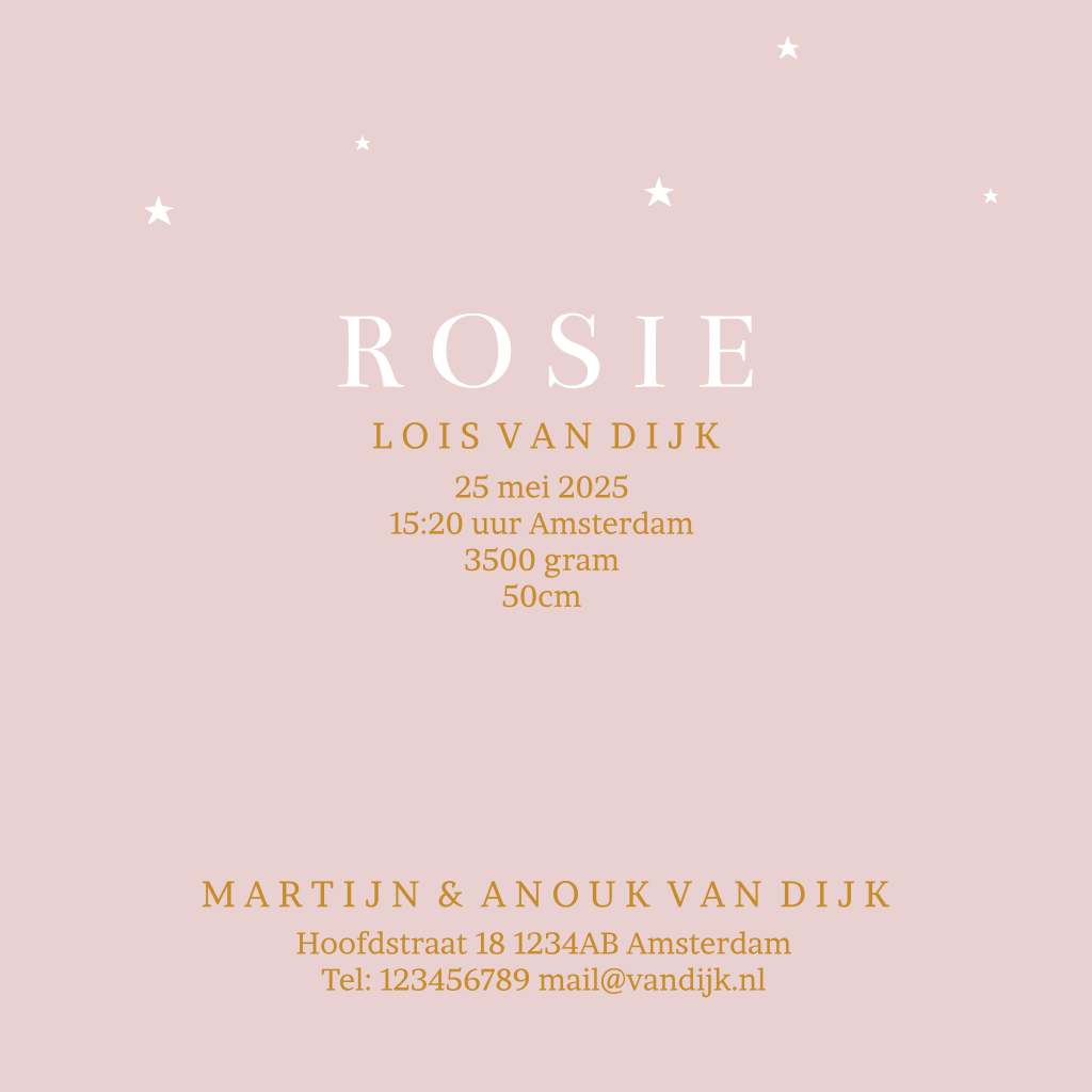 Een lief geboortekaartje met sterretjes en maan op een oudroze achtergrond. Alle kleuren zijn aanpasbaar. De naam en de datum worden in goudfolie gedrukt.
