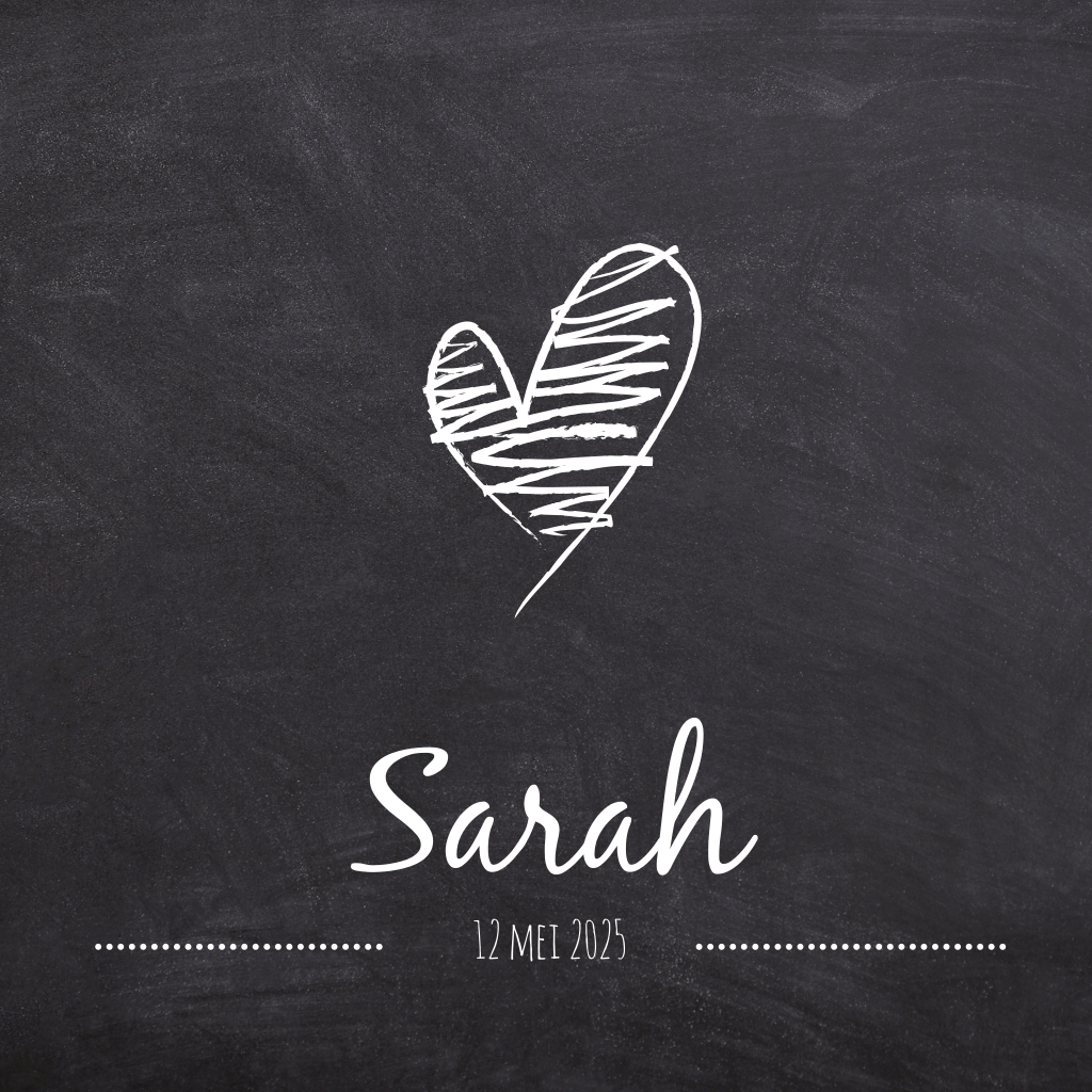 Stoere geboortekaart voor de geboorte van je dochtertje met een krijtbord-look achtergrond met daarop een hartje in goudfolie.