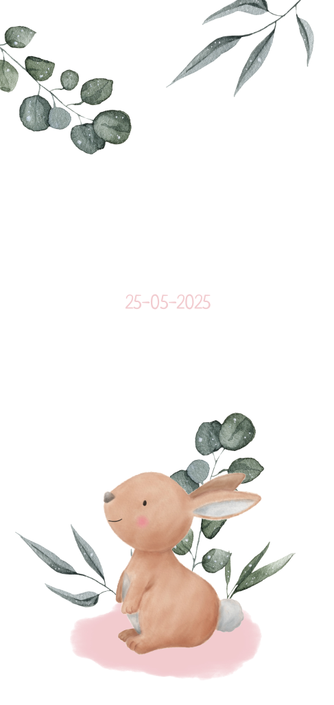 Hip geboortekaartje voor meisje met lieve illustratie van een konijn en botanische takjes. De babynaam en hartjes in goudfolie hartjes maken dit echt een trendy geboortekaartje!
