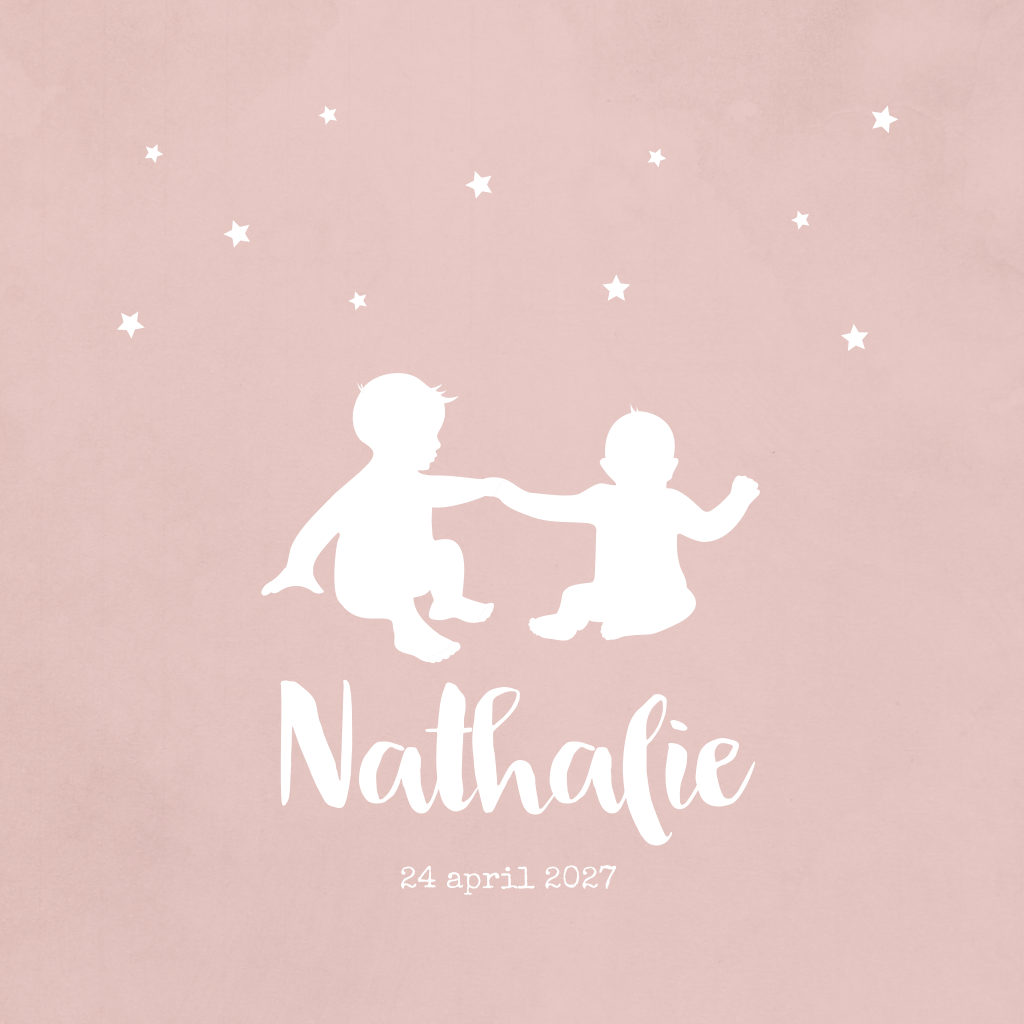Hippe oud roze geboortekaart voor je tweede dochtertje met een goudfolie silhouet van je zoontje met zijn kleine baby zusje en gouden sterretjes.