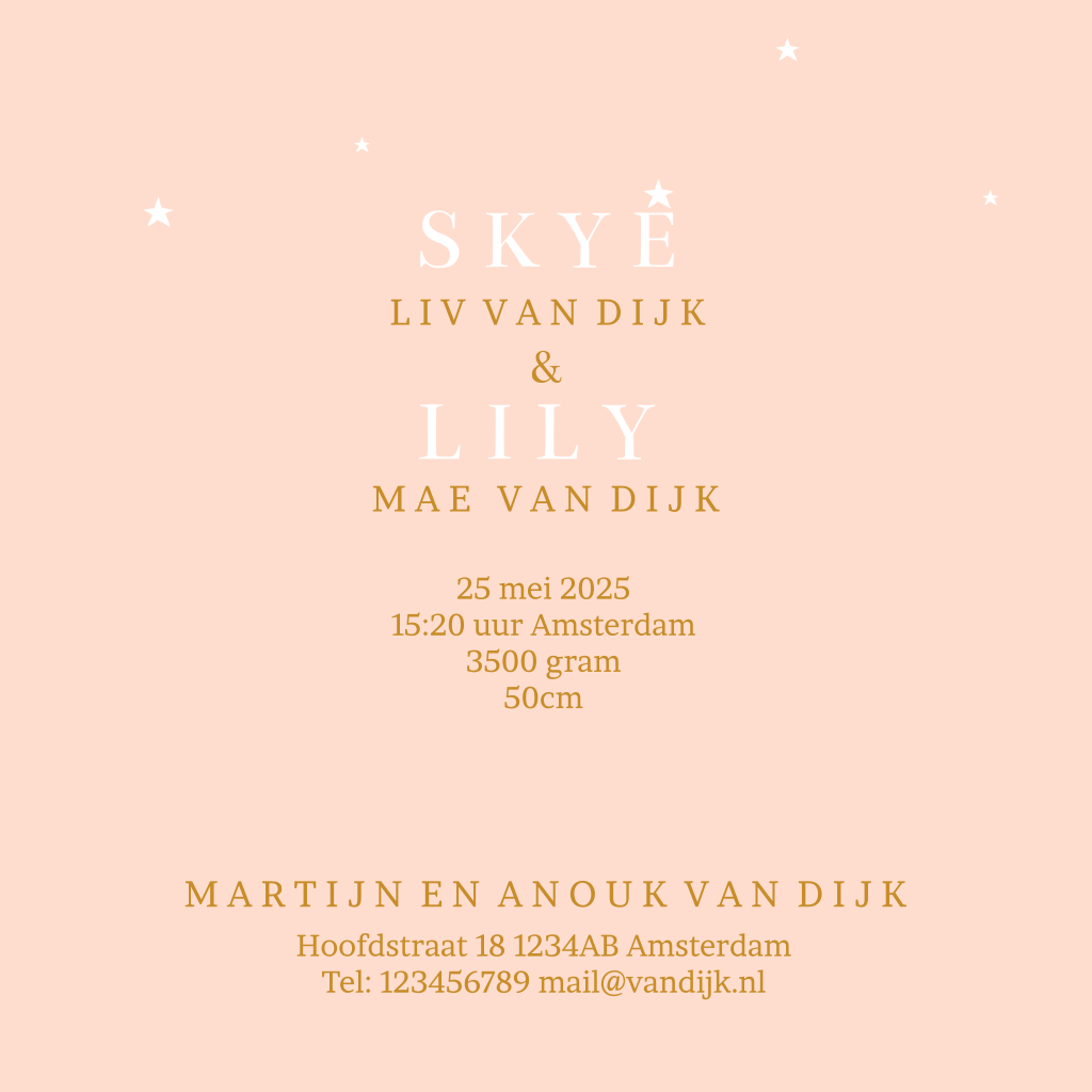 Een lief geboortekaartje voor twee meisjes, met sterretjes en maan op een roze achtergrond. De namen van de meiden worden in goudfolie gedrukt. Alle kleuren zijn aanpasbaar. Pas de tekst aan in de editor.