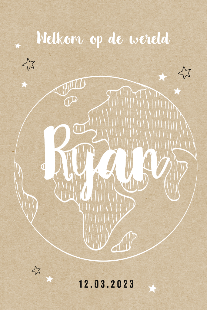 Een luxe babykaartje met wereldbol. De voorzijde is gewerkt met kraftlook en de naam in goudfolie. Op deze kaart is er ruimte voor een eigen foto.