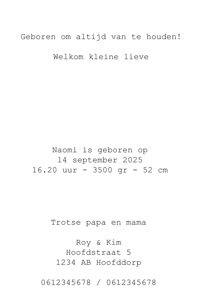 Let op: Deze kaart heeft een langere verzendtijd: voor 18.00 uur besteld = de volgende werkdag gedrukt en verzonden.