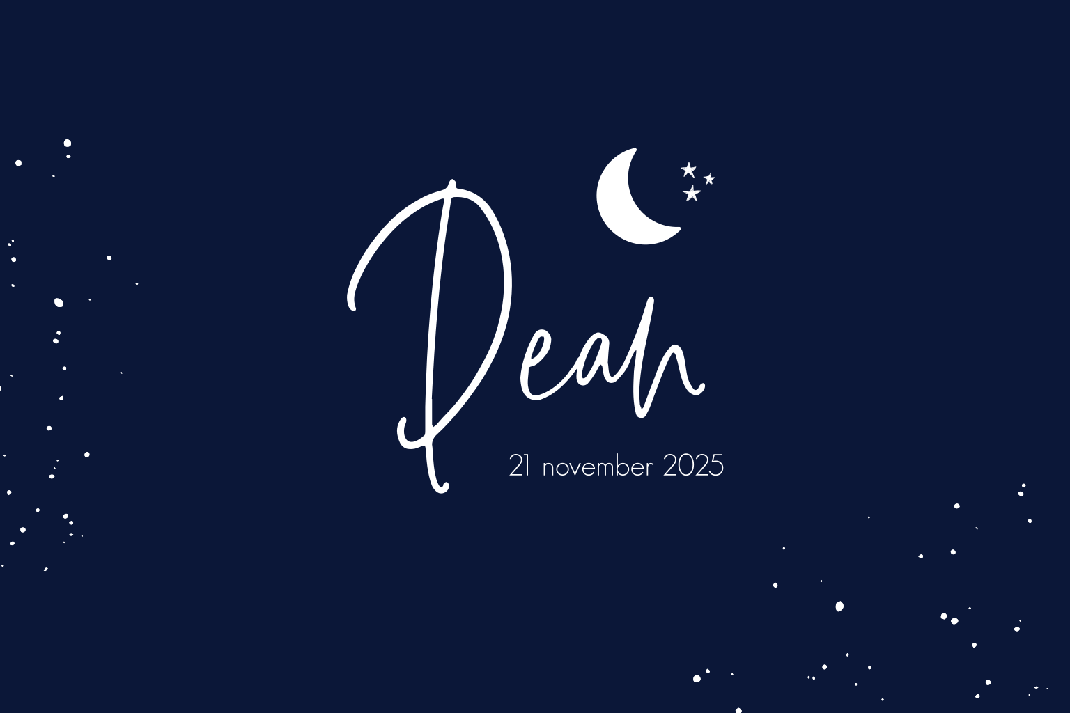 Goudfolie geboortekaartje met aan de ene kant de maan en sterren in goud en aan de andere kant de babynaam in goud.