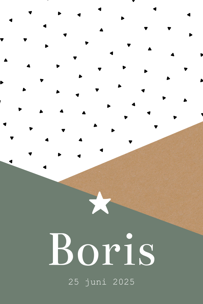 Geometrisch geboortekaartje met schuine vlakken en leuk driehoek patroontje. Dat is leuk! Je kunt ook het vogeltje of de babynaam in goudfolie laten drukken. Kies bij kleur voor 'goudfolie'.