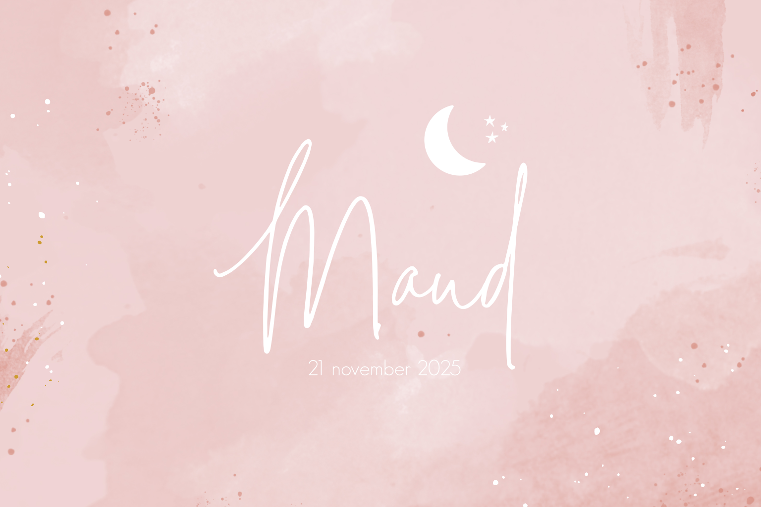 Lief geboortekaartje voor een meisje met goudfolie maan en sterren.
