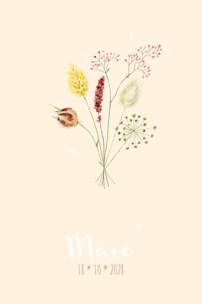 Een hip geboortekaartje met mooi geschilderde droogbloemen voor een meisje op zachtgeel. Met goudfolie in de naam en hartjes. Let op: Deze kaart heeft een langere verzendtijd: voor 18.00 uur besteld = de volgende werkdag gedrukt en verzonden.
