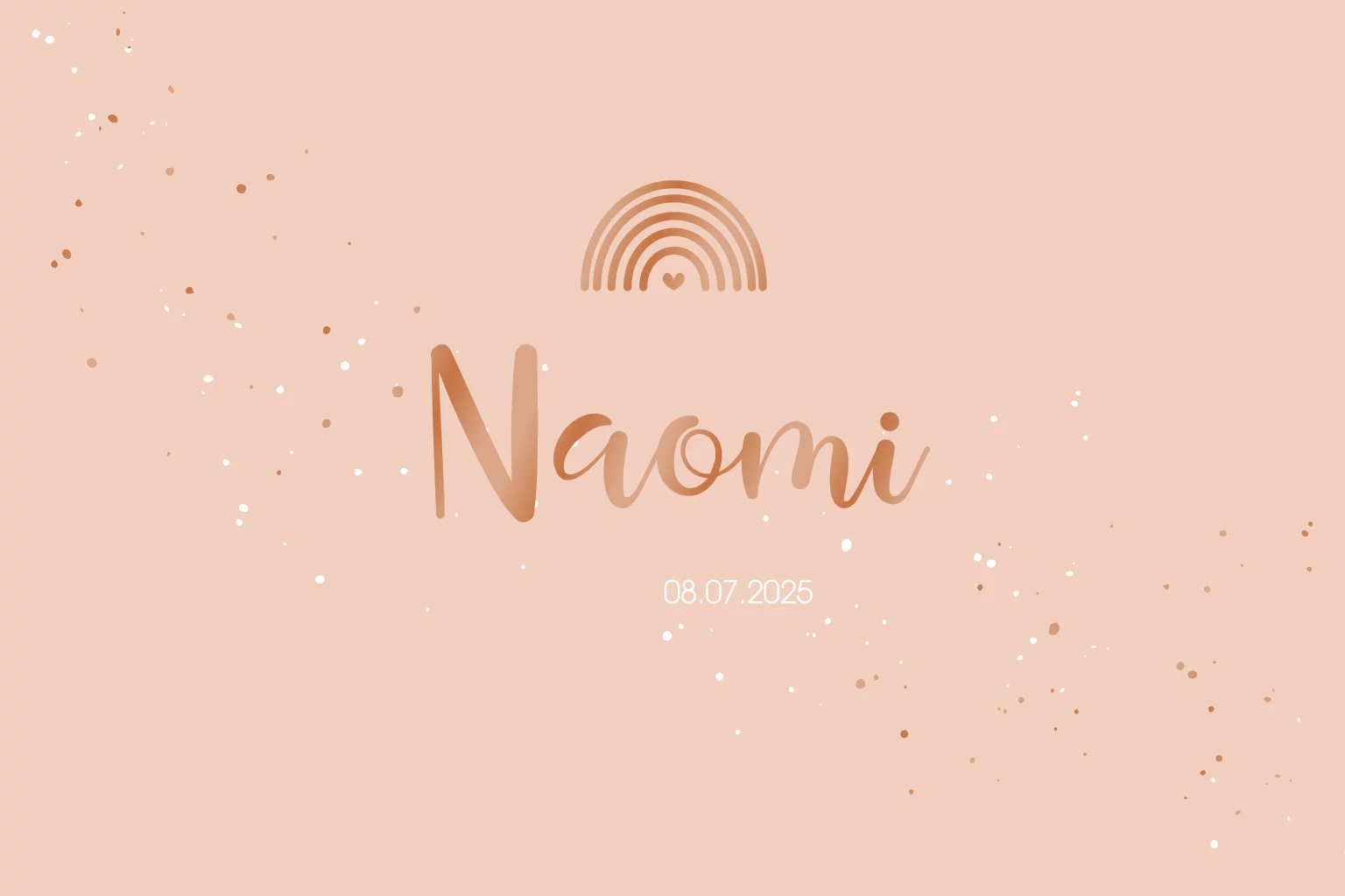 Lief hoogglans geboortekaartje met regenboog voor een meisje. Rond de naam zie je witte en spettertjes in hoogglans.
