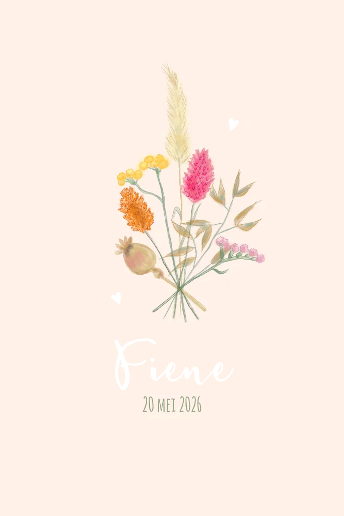 Een hip en mooi getekend geboortekaartje voor een meisje met droogbloemen op een zachtroze achtergrond. De naam en de hartjes worden in goudfolie gedrukt.