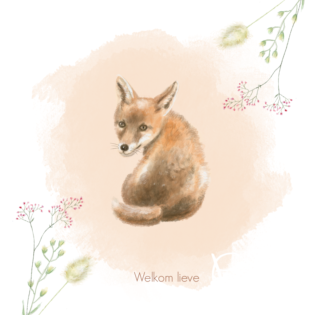 Een mooi, geschilderd geboortekaartje met een vosje en plantjes voor een meisje. Met rosefolie in de naam.Let op: Deze kaart heeft een langere verzendtijd: voor 18.00 uur besteld = de volgende werkdag gedrukt en verzonden.