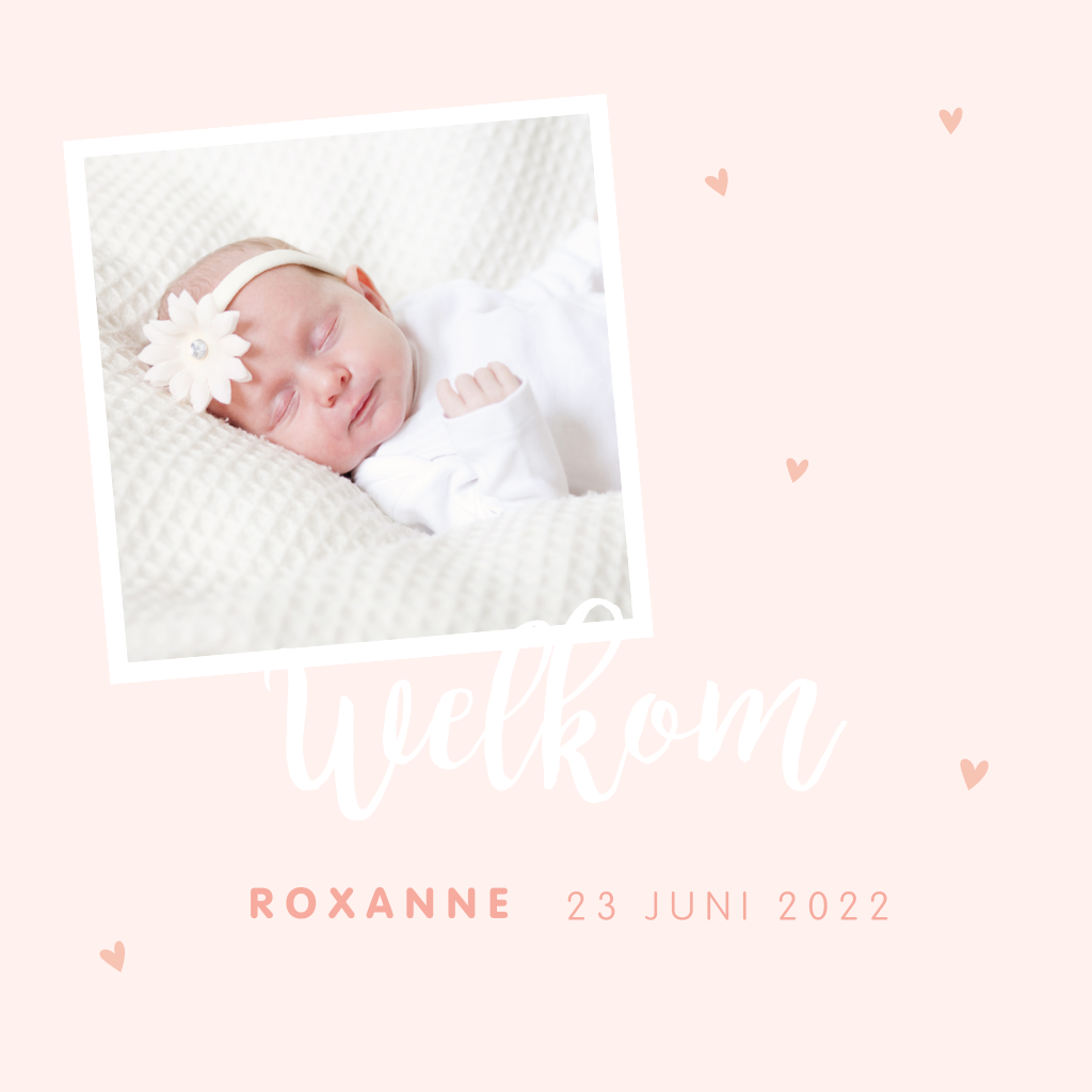Lief geboortekaartje met foto en 'welkom' in roségoudfolie. Ook de hartjes hebben een mooie glans in roségoud.