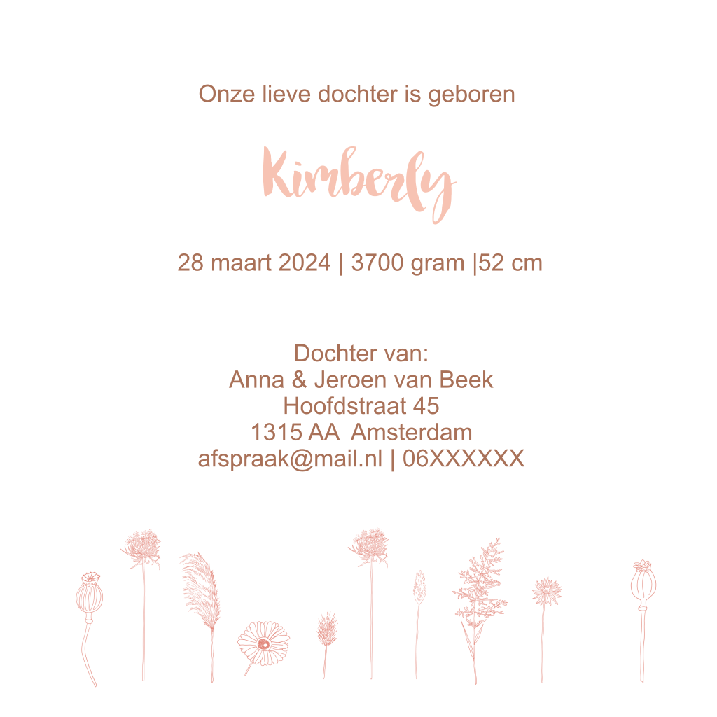 Geboortekaartje voor een meisje met hippe droogbloemen in pastelkleur en naam in echte roséfolie.