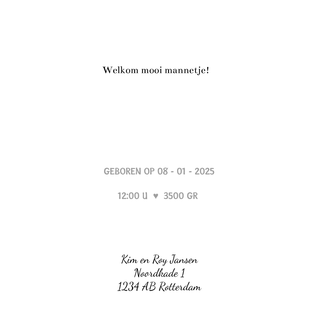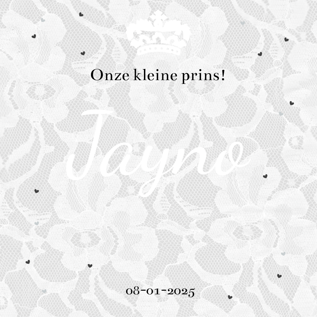 Super gaaf babykaartje zoon met kant, kroontje en klassieke typografie. De naam en het kroontje worden gedrukt met zilverfolie. Let op: Deze kaart heeft een langere verzendtijd: voor 18.00 uur besteld = de volgende werkdag gedrukt en verzonden.