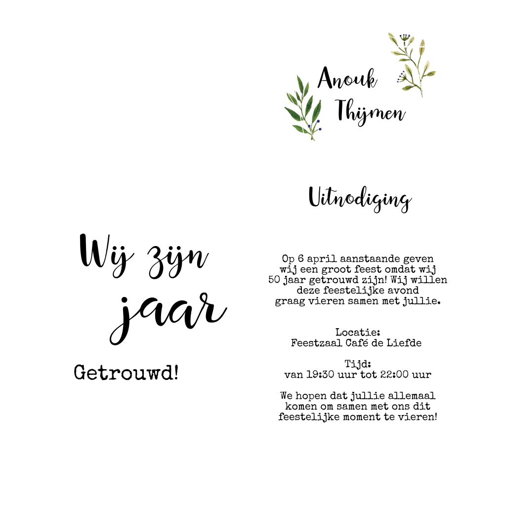 Hoera, 50 jaar getrouwd! Stuur vrienden en familie deze chique jubileumkaart met elementen in goudfolie en frisse takjes. Teksten en lettertypes zijn naar wens aan te passen. Maak hem zelf af en combineer hem met een bijpassende envelop!