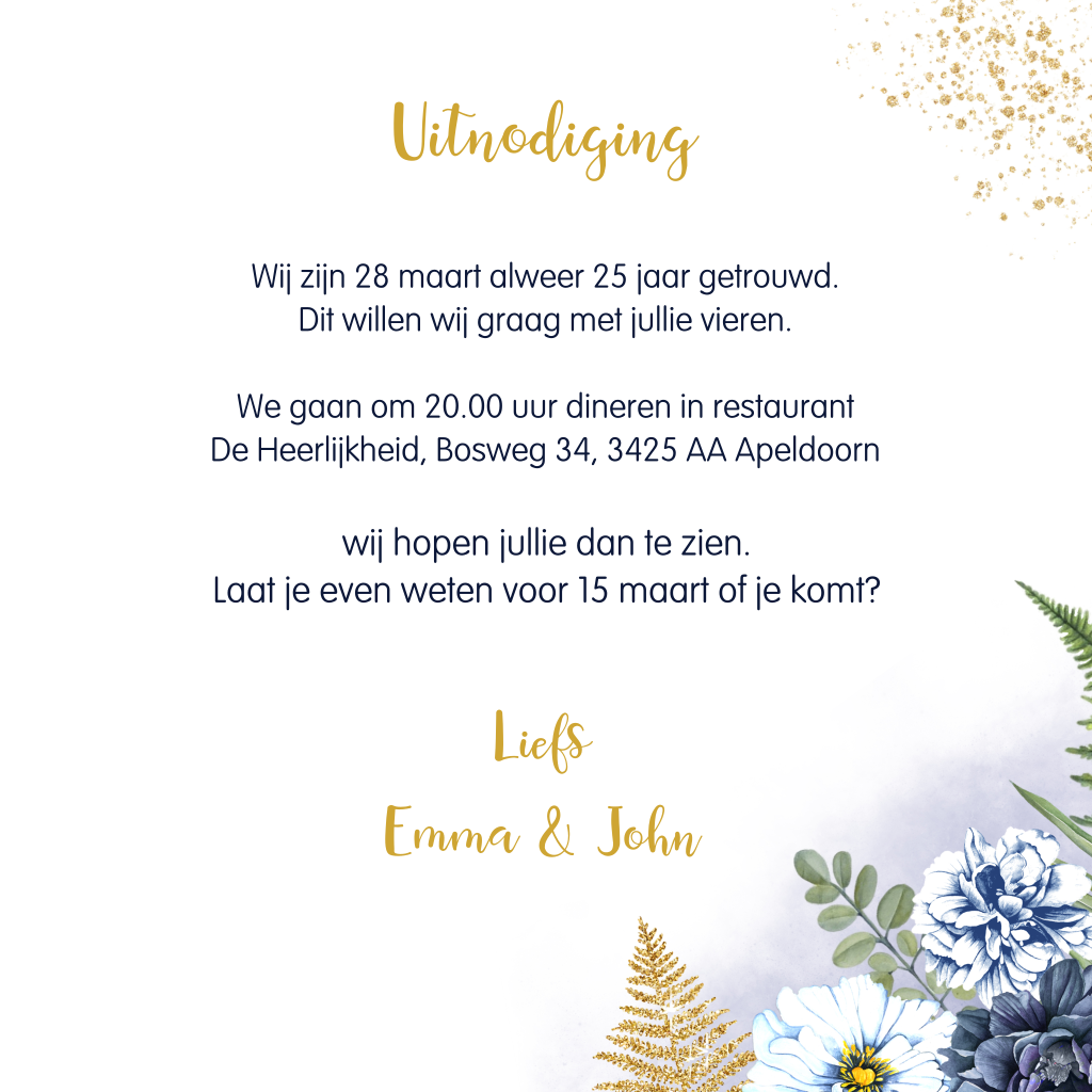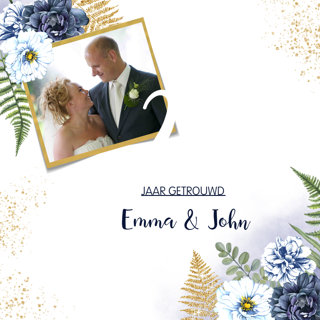Romantische, aquarel jubileumkaart met tekst in goudfolie en watercolour bloemen. Voorop staan gouden spetters en een foto met een kader.