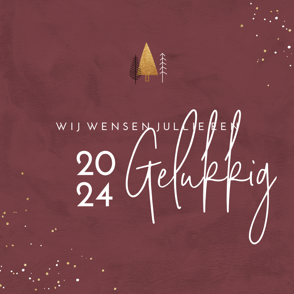De tekst en spetters in goudfolie maken dit een extra bijzondere kerstkaart! Met een actuele tekst en 3 kleine kerstbomen op een burgundy achtergrond. Pas de teksten op het kaartje aan in de online editor.