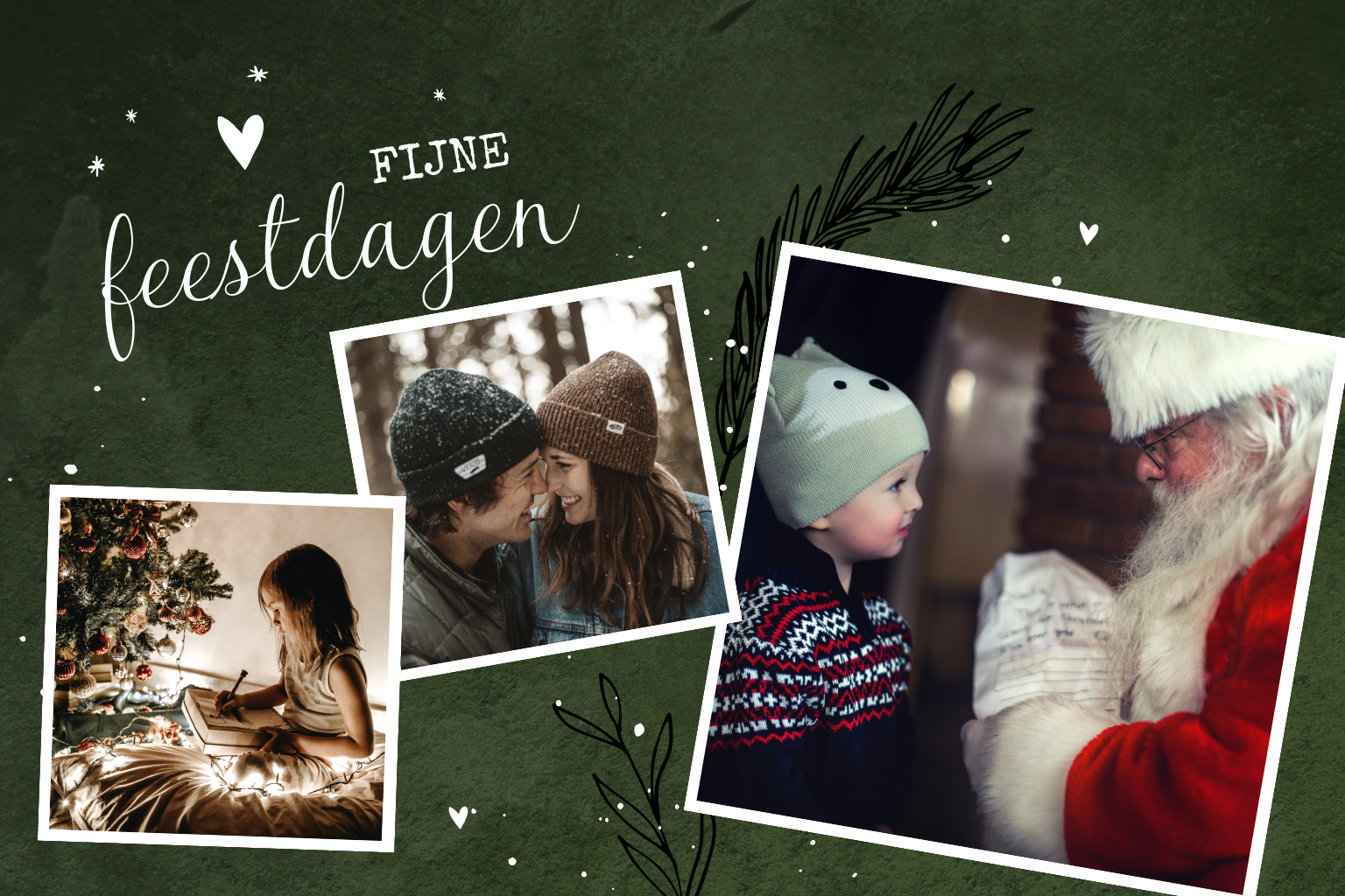 Ho ho ho! Deze donkergroene, feestelijke kerstkaart is gepimpt met 3 foto's, vrolijke stipjes, kersttakjes en teksten plus hartjes in luxe goudfolie. Iets voor jou? Maak het zelf af en stuur hem op!