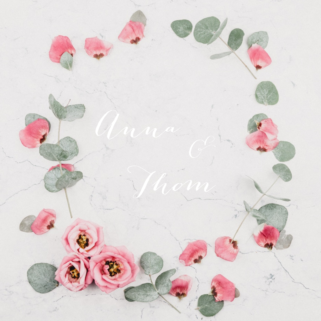 Romantische trouwkaart met tekst in goudfolie en een krans van rozen.
