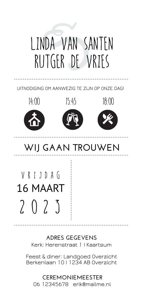 Hippe trouwkaart met hart en verfspetters van luxe goudfolie. Ook tof zijn de icoontjes voor de verschillende activiteiten van jullie dag. Maak hem compleet met eigen teksten en één van onze enveloppen!
