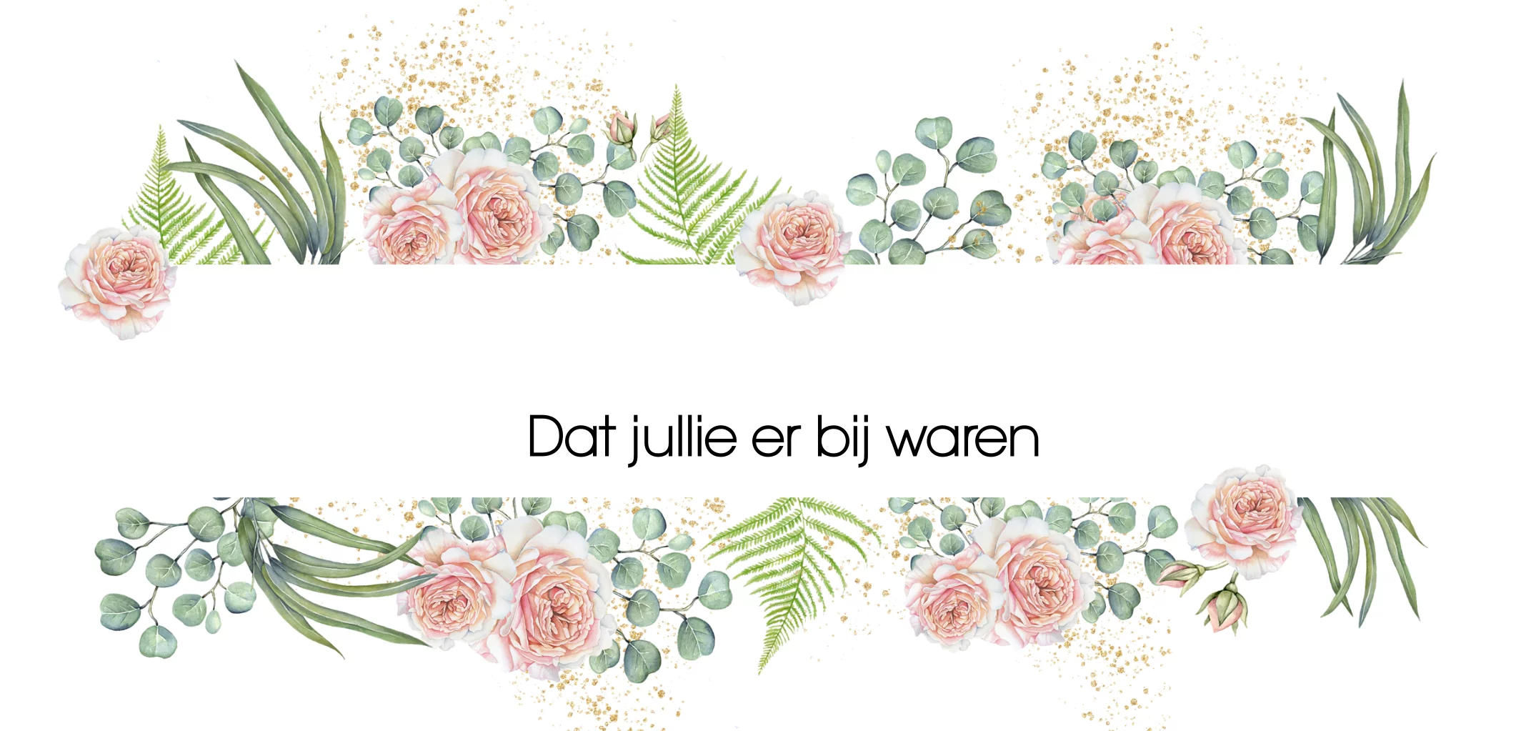 Sfeervolle bedankkaart voor je trouwgasten met botanische rozen en eucalyptus takjes. Door de roségoudfolie tekst heeft deze kaart een chique uitstraling. Pas je eigen trouwfoto in de editor aan.