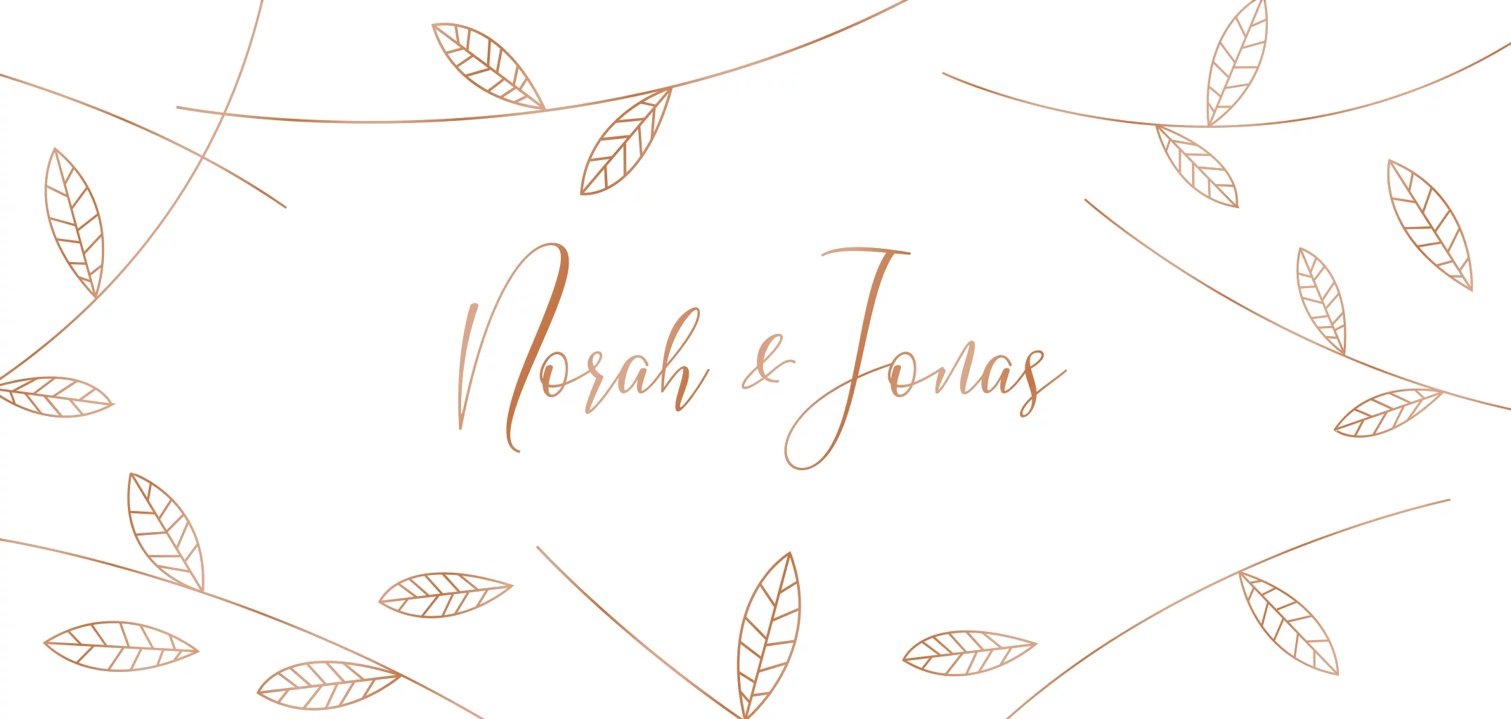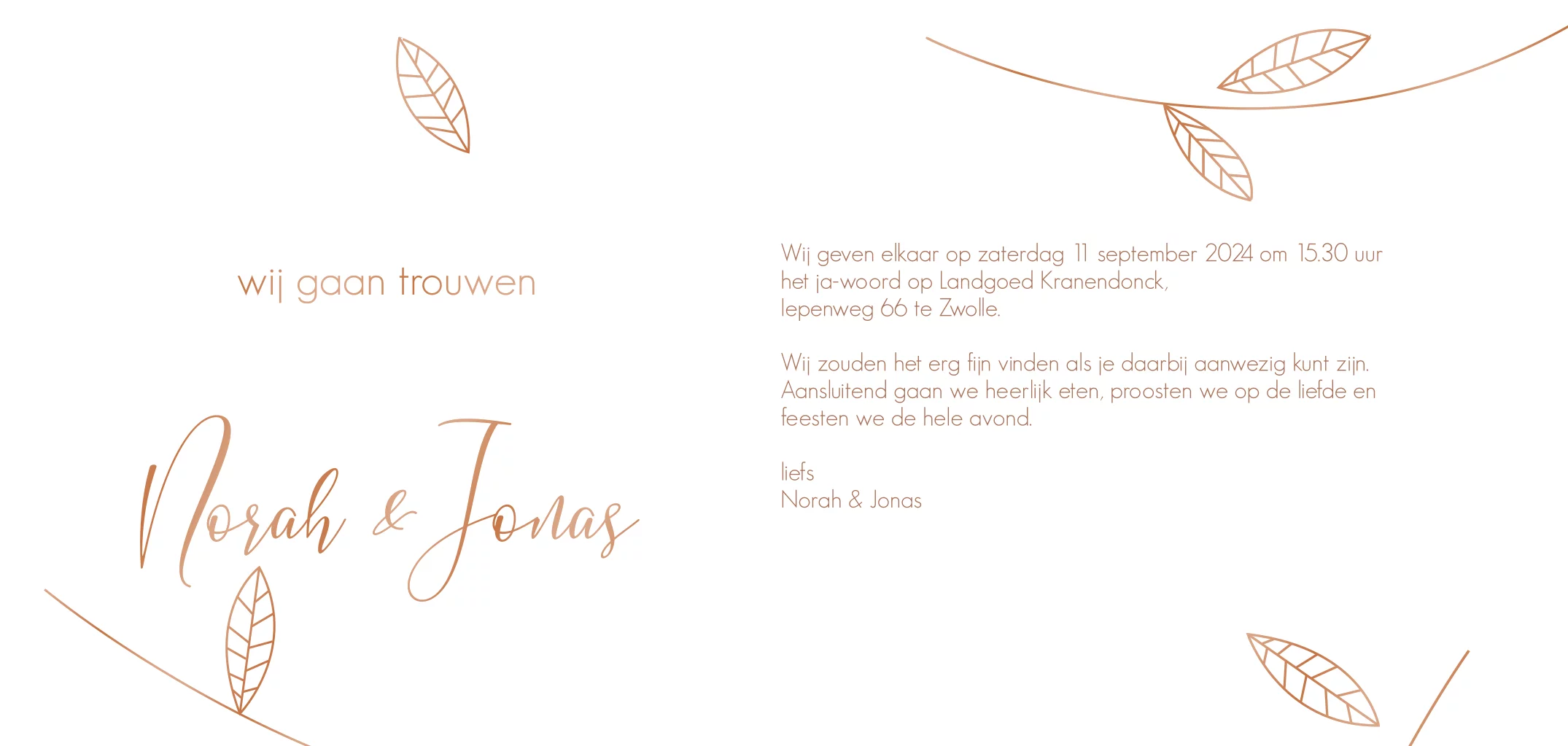Chique trouwkaart in hoogglans. Met blaadjes en takjes en sierlijke typografie op een witte achtergrond. Verander de hoogglans eventueel in goud- of zilverfolie.