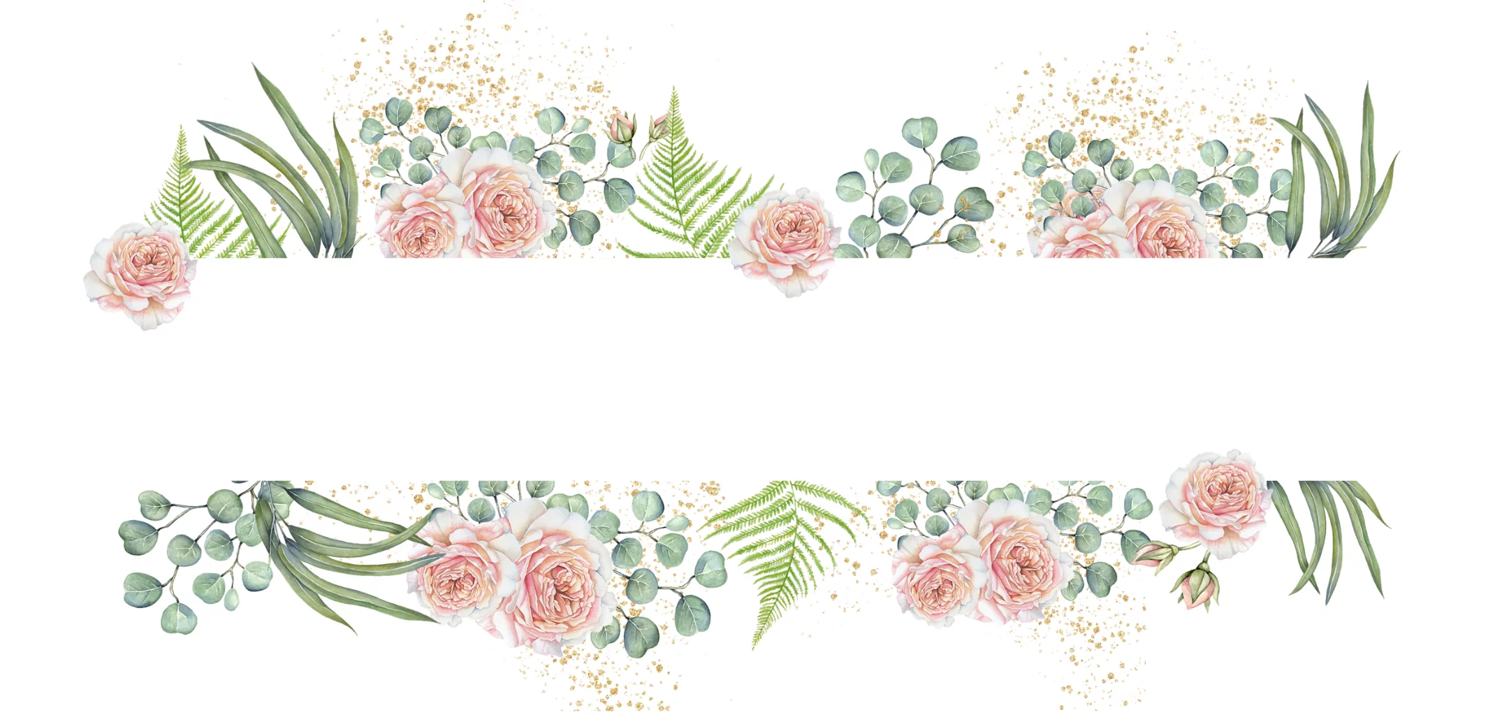 Panorama trouwkaart met botanische rozen en tekst in roségoudfolie