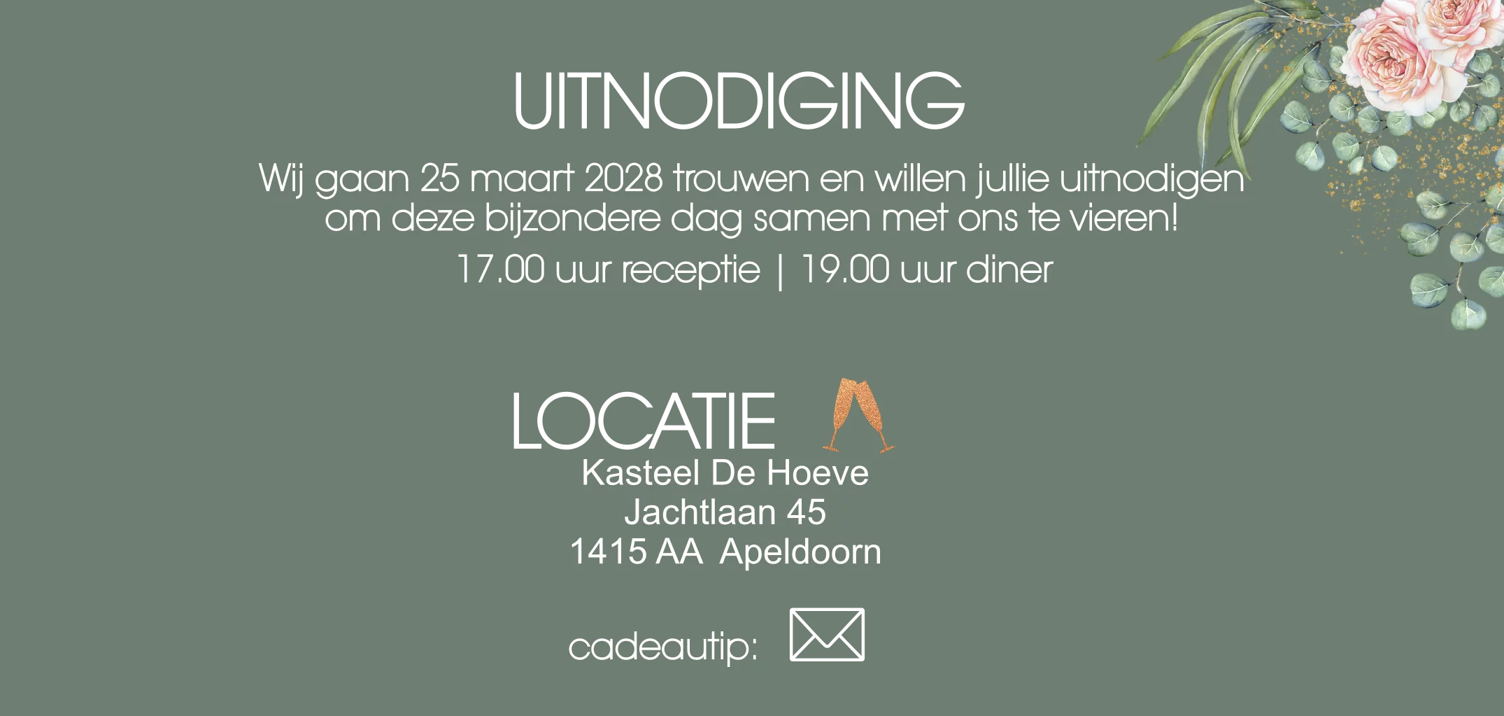 Stijlvolle trouwkaart met mooie botanische rozen en eucalyptus takjes. Jullie namen worden in roségoudfolie gedrukt. Wist je dat we een bijpassende save the date kaart en bedankkaart aanbieden?
