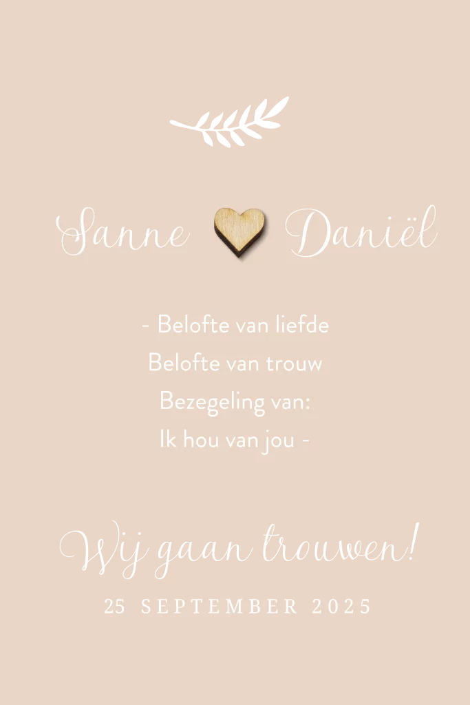 Stijlvolle roségoudfolie trouwkaart met takje en houten hartje