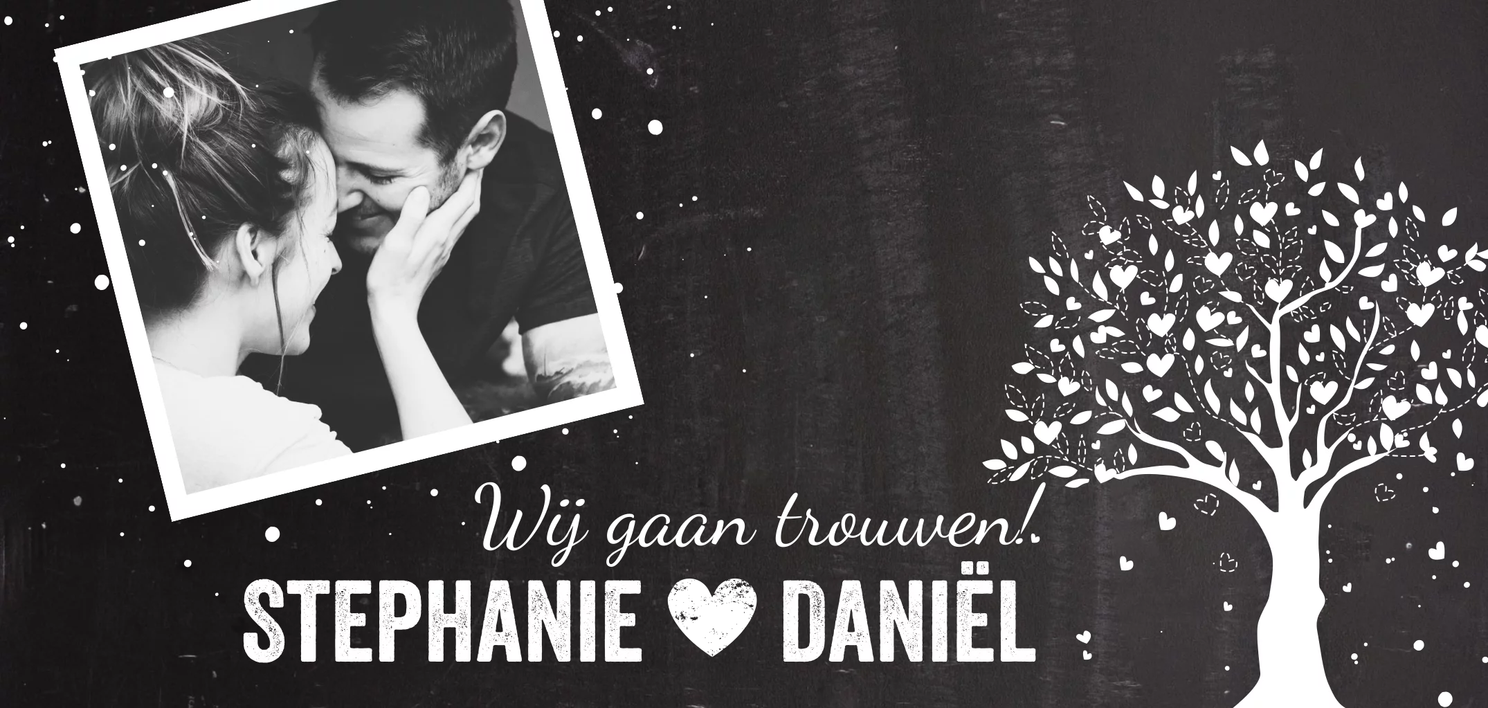 Stoere kaart met de tekst wij gaan trouwen en een hartje in goudfolie. De achtergrond heeft een krijtbord uitstraling.Op de voorkant zie je een witte getekende boom vol met hartjes. In de fotovorm kan je zelf een mooie foto van jullie uploaden. Dit kan heel makkelijk in onze online editor. Hier kan je ook makkelijk de achtergrond en teksten aanpassen. Let op: Deze kaart heeft een langere verzendtijd: voor 18.00 uur besteld = de volgende werkdag gedrukt en verzonden.