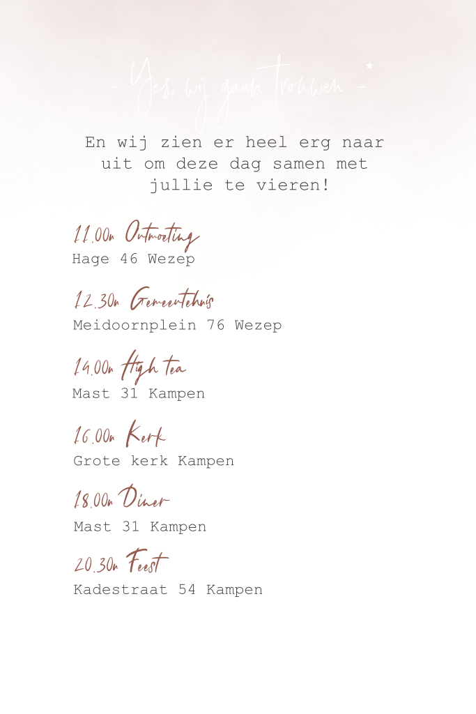 Deze trouwkaart in roestkleur met sterren en maan in goudfolie kun je zelf aanpassen naar zilverfolie of koperfolie. Ook de andere kleuren en het lettertype zijn aan te passen.