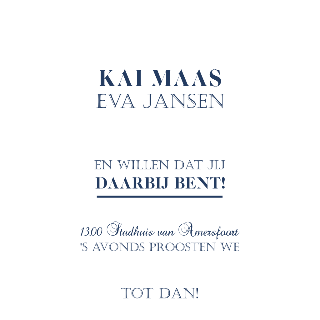 Een prachtige en feestelijke uitnodiging voor jullie bruiloft. De goudfolie geeft een luxe uitstraling en is erg mooi in combinatie met de tekst in donkerblauw - wit. Let op: Deze kaart heeft een langere verzendtijd: voor 18.00 uur besteld = de volgende werkdag gedrukt en verzonden.