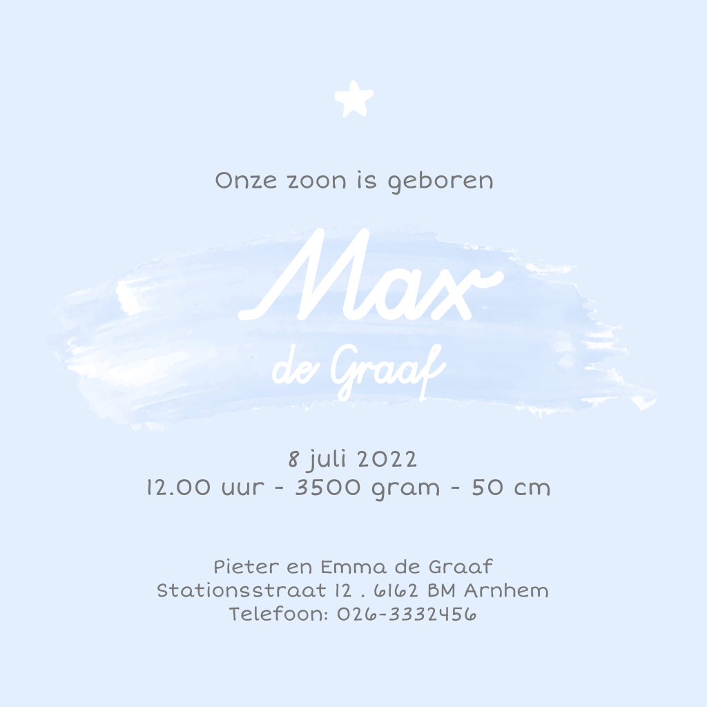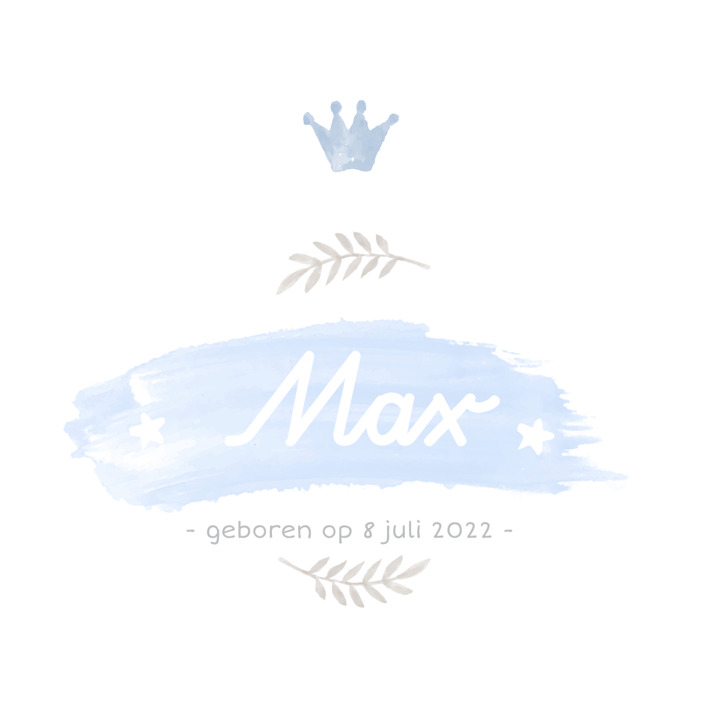 Watercolour geboortekaartje met kroontje en verfstreep in laveldel-kleur met in zilverfolie de naam van de baby. Let op: Deze kaart heeft een langere verzendtijd: voor 18.00 uur besteld = de volgende werkdag gedrukt en verzonden.