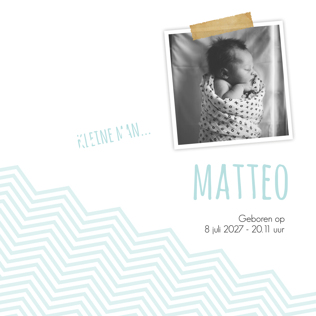 Mooie babykaart voor een jongen met foto en leuke blauwe zigzags! De tekst "Hallo" in goudfolie geeft een luxe uitstraling aan deze geboortekaart. De tekst en de foto kunnen in de editor aangepast worden. Let op: Deze kaart heeft een langere verzendtijd: voor 18.00 uur besteld = de volgende werkdag gedrukt en verzonden.