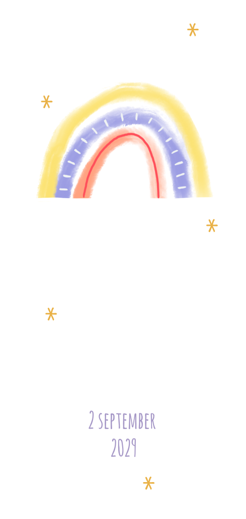 Een hip geboortekaartje voor een meisje met een regenboog, hartje, en sterren. De naam en het hartje worden in goudfolie gedrukt.
