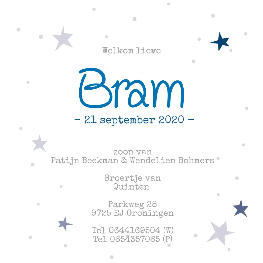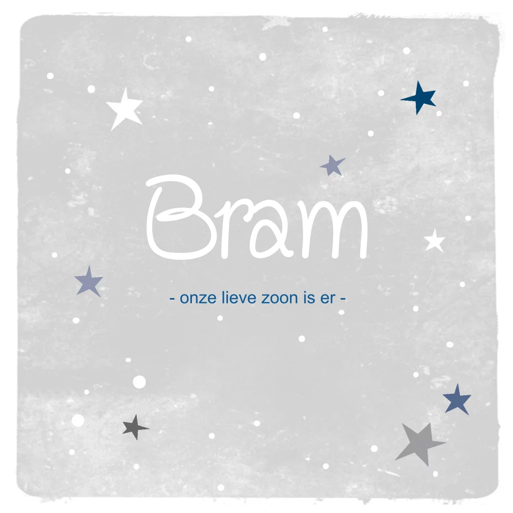Schrijf de naam van jouw baby in zilverfolie op de stoere geboortekaart met sterren. Het witte kader heeft het geboortekaartje een moderne look. Let op: Deze kaart heeft een langere verzendtijd: voor 18.00 uur besteld = de volgende werkdag gedrukt en verzonden..