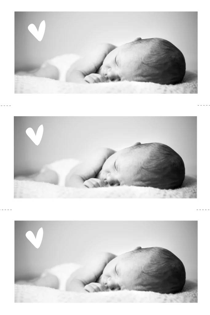 Zet drie keer de foto van je baby op dit kaartje en knip na het ontvangen de fotolabels los op het hulplijntje.