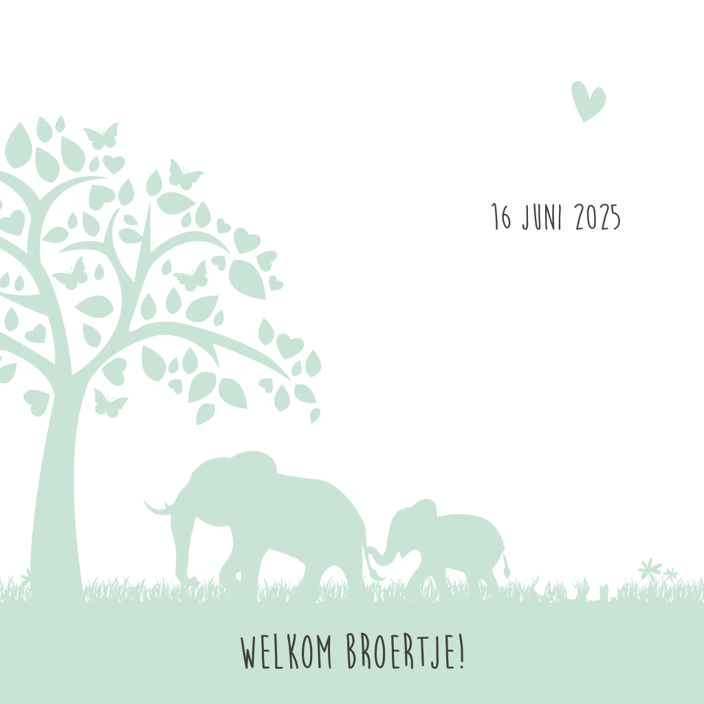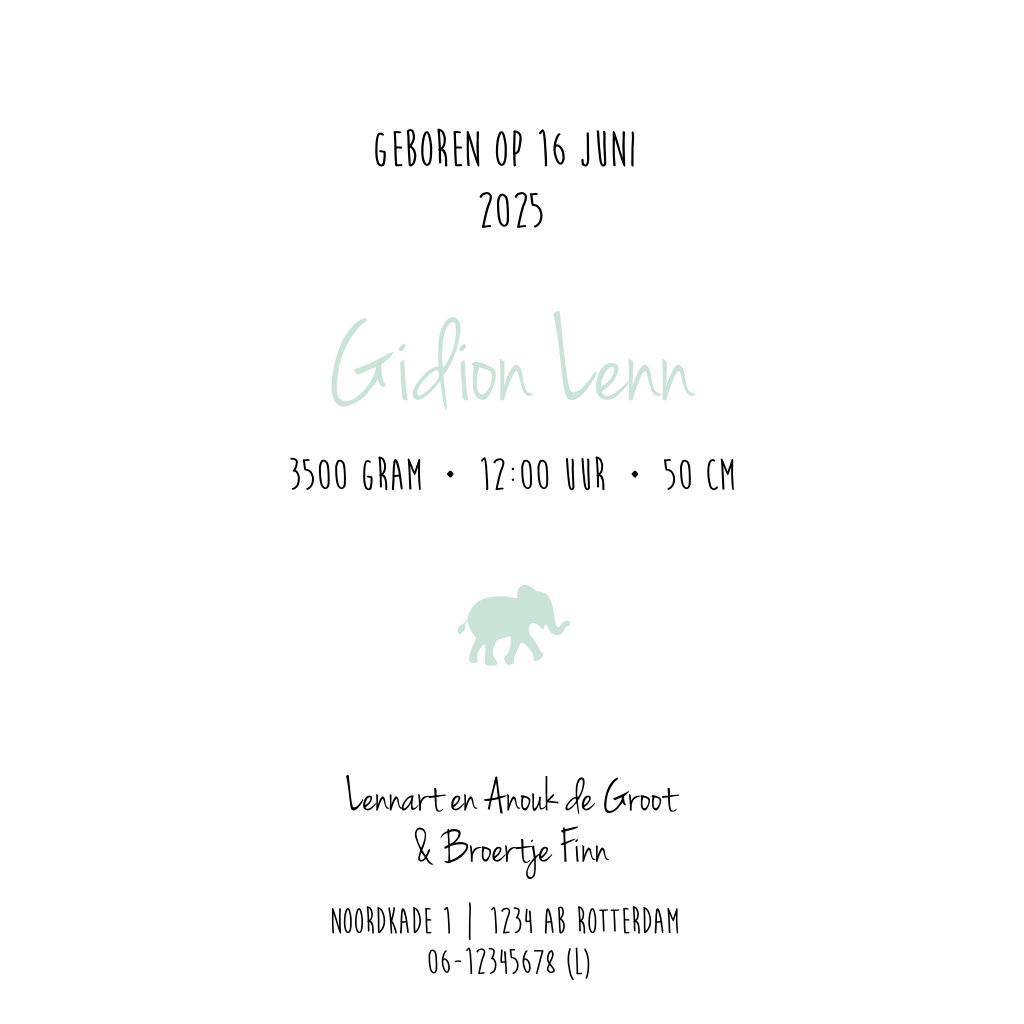 Goudfolie geboortekaartje met mint silhouetten van olifanten en een boom. Het laatste olifantje stelt jouw zoontje voor. Dit olifant is in goudfolie gedrukt. Ook de naam van de jongen staat in goudfolie. Liever alle olifantjes in goud laten drukken? Pas de kleur aan naar goudfolie. Let op: Deze kaart heeft een langere verzendtijd: voor 18.00 uur besteld = de volgende werkdag gedrukt en verzonden.
