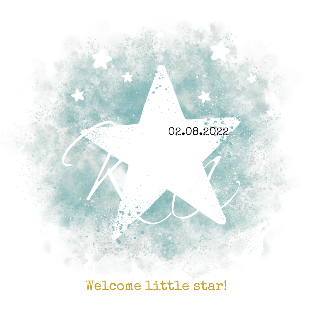 Vrolijk geboortekaartje met stoere ster tussen groen/blauw aquarel met goudfolie sterren en de naam van je jongen in goudfolie. Let op: Deze kaart heeft een langere verzendtijd: voor 18.00 uur besteld = de volgende werkdag gedrukt en verzonden.